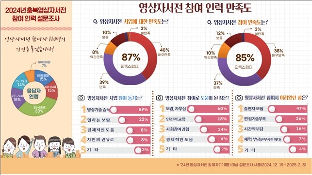 한편, 충북도의 ‘영상자서전’ 사업은 도민의 인생을 영상으로 기록해 후손에게 역사 기록으로 전승하는 사업으로 충북도민이면 누구나 무료로 자신의 인생을 남길 수 있으며, 작년까지 15,773명의 도민이 참여해 자신의 인생을 영상으로 기록하여 충북도의 역사 기록으로 남겼다.