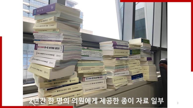 이지원 의원은 “종이 총 100kg을 생산하는 데에 이산화탄소 약 112kgCO2eq가 배출되고 이는 30년생 소나무 17그루가 있어야 상쇄할 수 있다”며 무분별한 종이 사용의 감축 필요성을 강조했다.
