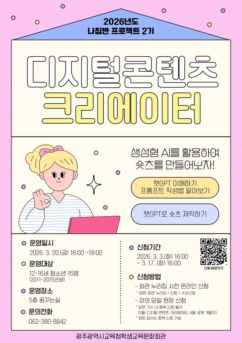 ‘나침반 프로젝트’는 3월 20일부터 매월 1회씩 총 10회 운영된다. 청소년이 멘토와 짝을 이뤄 AI 숏츠 제작 등 디지털 콘텐츠 크리에이터, 로봇 공학 등 유망직업을 체험한다.