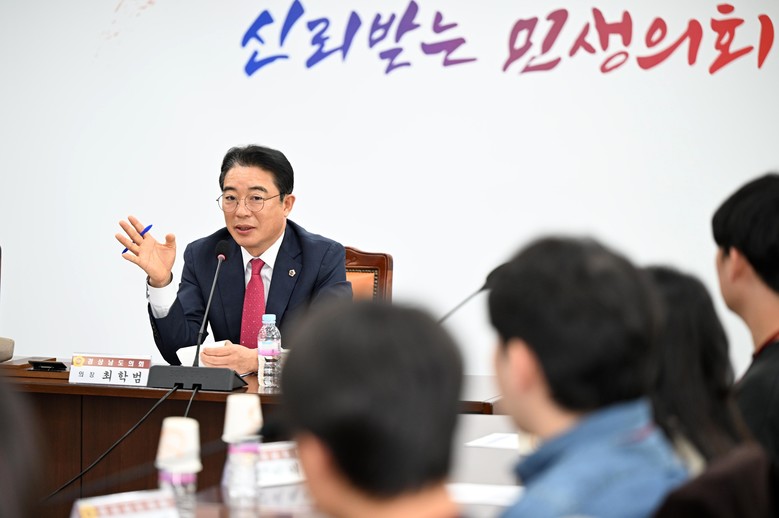 [경남 세계타임즈=최성룡 기자] 경상남도의회(의장 최학범)는 17일 “청년(인턴 대학생)과의 소통 간담회”를 즐거운 분위기 속에서 마무리했다고 전했다. 청년들과 의장이 기탄없는 대화를 나누며 서로의 생각을 공유하고, 청년들의 어려움과 바라는 것을 맘껏 전하는 뜻깊은 시간이었다는 평가다.