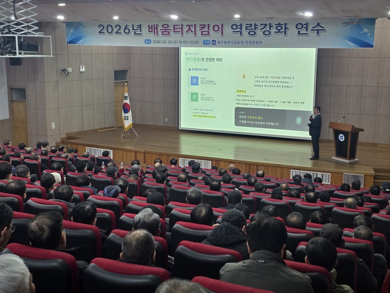 [광주 세계타임즈=손권일 기자] 광주시교육청(교육감 이정선)은 25일 광주창의융합교육원 대강당에서 학교 배움터지킴이 340여 명을 대상으로 ‘배움터지킴이 역량강화 연수’를 실시했다.