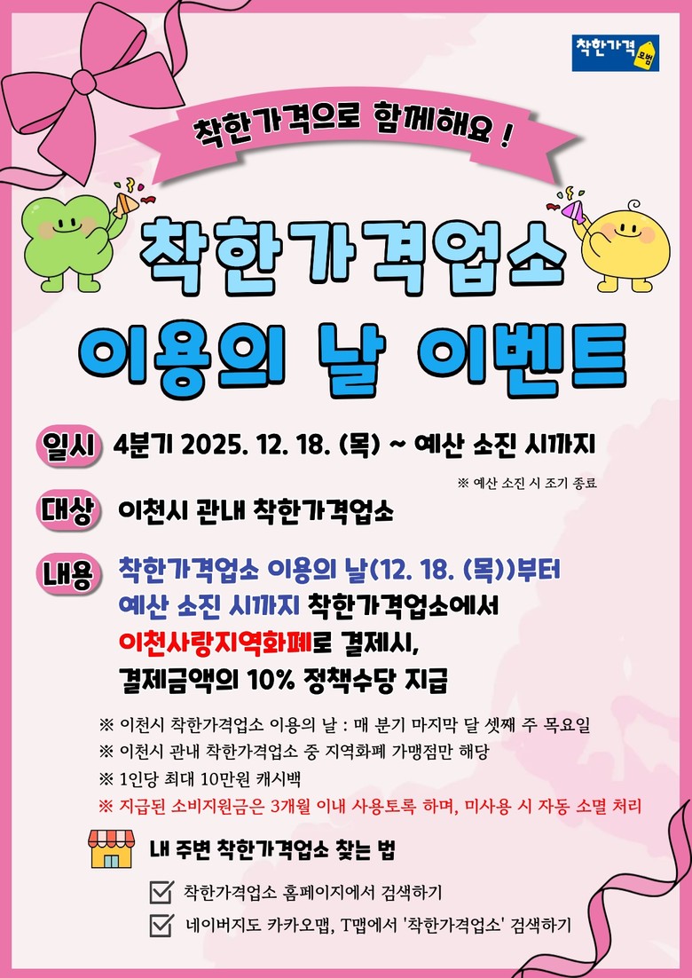 이 이벤트는 2025년 12월 18일(목)부터 예산 소진 시까지 진행되며, 기간 내 이천사랑 지역화폐로 착한가격업소(지역화폐 가맹점)에서 결제한 시민에게 결제액의 10%를 정책수당(적립금)으로 지급한다. 1인당 최대 지급 한도는 10만 원이다.
