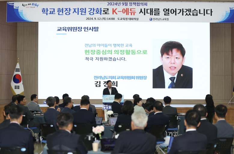 [전남 세계타임즈=우덕현 기자] 전라남도의회 교육위원장 김정희 의원(더불어민주당ㆍ순천3)이 지난 9월 12일, 전라남도교육청 대회의실에서 열린 ‘2024년 9월 전남교육 정책협의회’에 참석하여 ‘K-에듀’ 시대를 열어갈 전남교육을 위해 함께 고민하고 적극 지원할 것을 다짐했다.