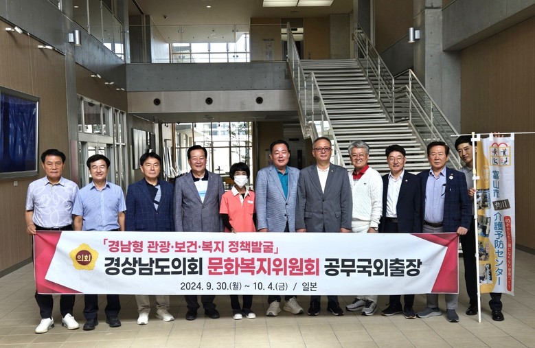 경상남도의회 문화복지위원회(위원장 박주언)는 2일, 일본 도야마시에 위치한 카도카와 개호예방센터를 공식 방문해 시설 관계자로부터 개호예방 프로그램 현황과 시설 운영 체계 등 설명을 듣고 시설을 둘러본 뒤 노인성 질환 예방 정책의 필요성과 경남지역 적용 방안에 대해 간담회를 진행했다.