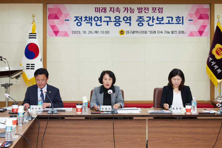 [대구 세계타임즈=한성국 기자] 대구시의회 의원연구단체 ‘미래 지속가능발전 포럼’(대표 전태선 의원)은 10월 26일(목) 오후 1시 의회 3층 회의실에서 소속단체 의원(대표 전태선, 간사 허시영, 임인환, 박우근, 김대현, 이성오, 류종우, 황순자, 권기훈, 박소영, 손한국, 이동욱, 김원규)이 참석한 가운데 의원 정책연구용역 중간보고회를 개최했다.