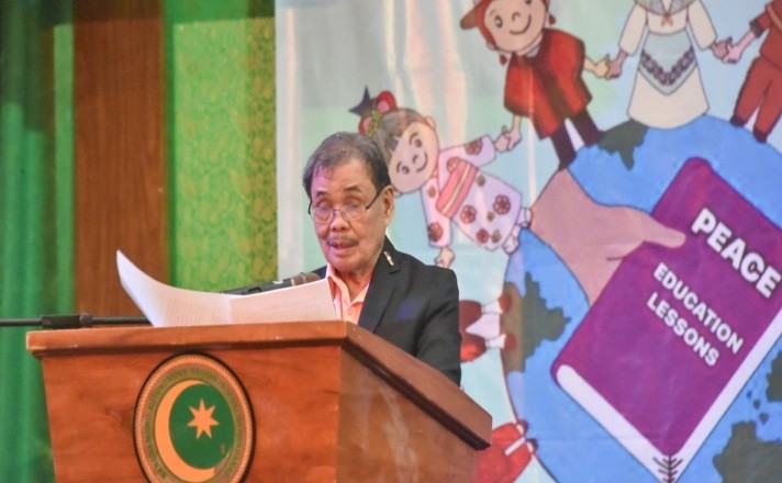 | ▲제1회 방사모로 평화 교육 회의에서 모하그헐 이크발 방사모로 무슬림 민다나오 자치구역(BARMM) 기초고등기술교육부(MBHTE) 장관이 기념사를 하고 있다 |