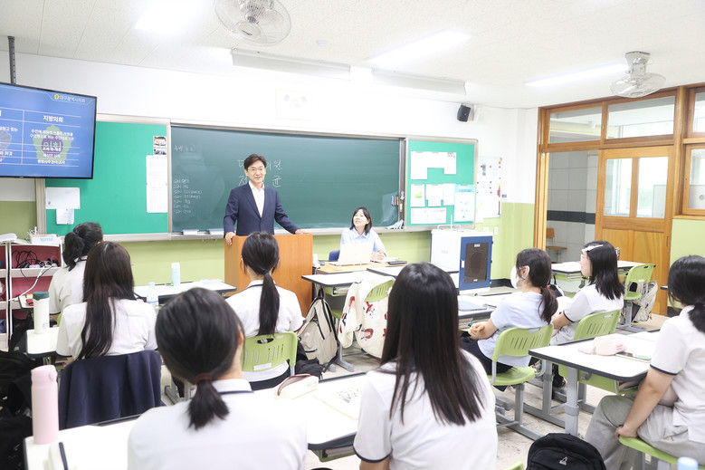 정 의원은 우리나라 정치제도를 외국 선진사례와 비교하는 등 학생들의 눈높이에서 설명하며 학생들의 집중을 이끌어냈다. 그리고 주민들의 목소리를 들을 수 있는 여러 가지 제도를 소개하면서 청소년들이 민주시민으로서 지역사회에 기여할 수 있는 방법을 제시했다.
