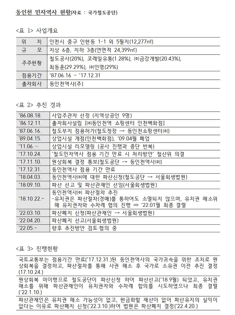더불어민주당 허종식 국회의원(국회 국토교통위원, 인천 동구미추홀구갑)이 국가철도공단으로부터 받은 자료에 따르면, 민간 사업자인 ㈜동인천역사의 파산에 따라 신고된 공공과 민간의 채권이 각각 229억원, 495억원으로 집계됐다.
