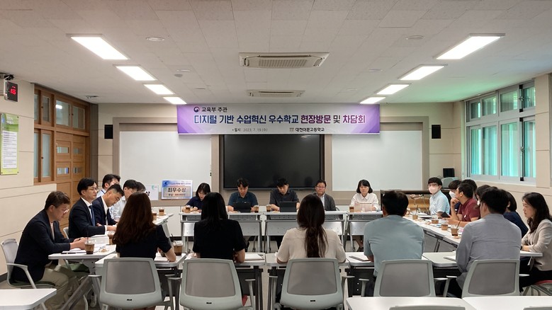 [대전 세계타임즈=이채봉 기자] 2023년 7월 19일, 미래교육을 선도하는 대전이문고(교장 김동춘)에 교육부 디지털교육전환담당관, 디지털인프라담당관, 교육콘텐츠정책과장을 비롯한 10여 명 의 디지털교육 실무자들과 대전광역시교육청 과학직업정보과 실무자들이 함께 방문하였다. 이번 방문은 디지털 기반 수업의 선도적 역할을 하고 있는 대전이문고와 현장 중심의 디지털 교육 정책을 추진하는 교육부가 ‘학업역량 신장을 위한 디지털 교수·학습 모델 개발과 에듀테크 활용 방안을 모색’하기 위해 마련하였다.