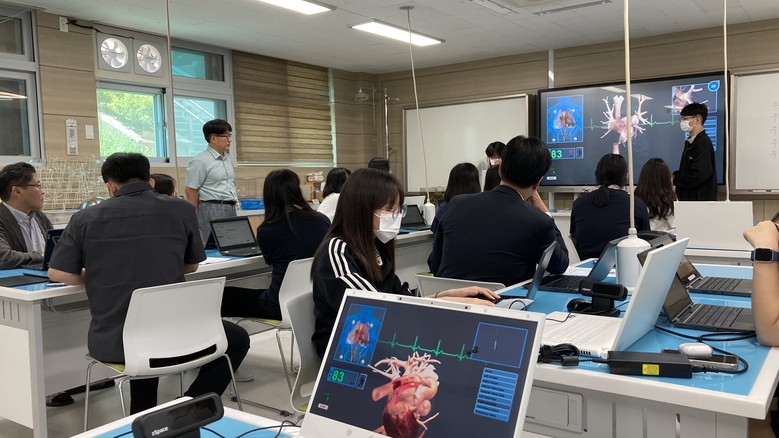 교육부 디지털교육 실무자들은 3D영상을 이용한 노벨과학동아리 수업과 학교 LMS인 웨일 스페이스와 각종 에듀테크를 활용한 영어 수업을 수강생(학생)으로 2시간 동안 수업에 참여하여 학생의 입장에서 에듀테크 교육의 효율성을 직접 체험하였다.
