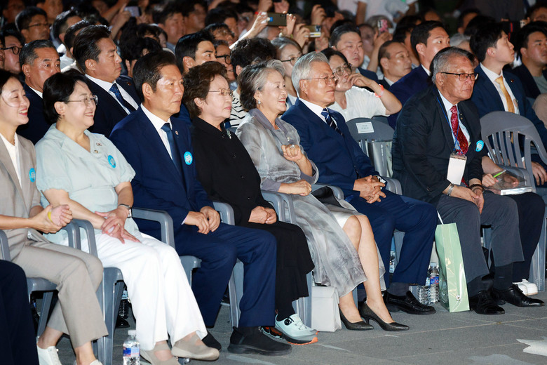[세계타임즈 = 진정화 기자] 문재인 전 대통령 부부와 노무현 전 대통령 부인 권양숙 여사, 더불어민주당 정청래 대표가 15일 서울 세종대로 광화문광장에서 열린 제21대 대통령 국민임명식 '광복 80년, 국민주권으로 미래를 세우다' 행사에 참석해 있다. 2025.8.15 [대통령실통신사진기자단]