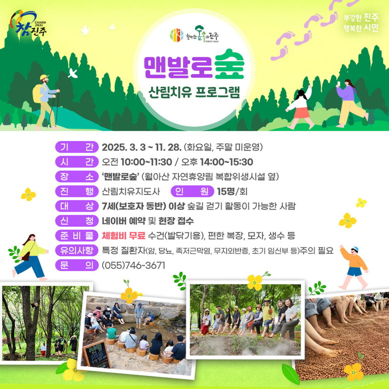 프로그램 참가는 무료이며, 네이버에서‘월아산 숲속의 진주’를 검색하여 예약하면 된다. 인원 미달일 경우에는 당일 현장 접수도 한다. 자세한 사항은 월아산 숲속의 진주 누리집(www.jinju.go.kr/forestjinju)에서 확인할 수 있다.
