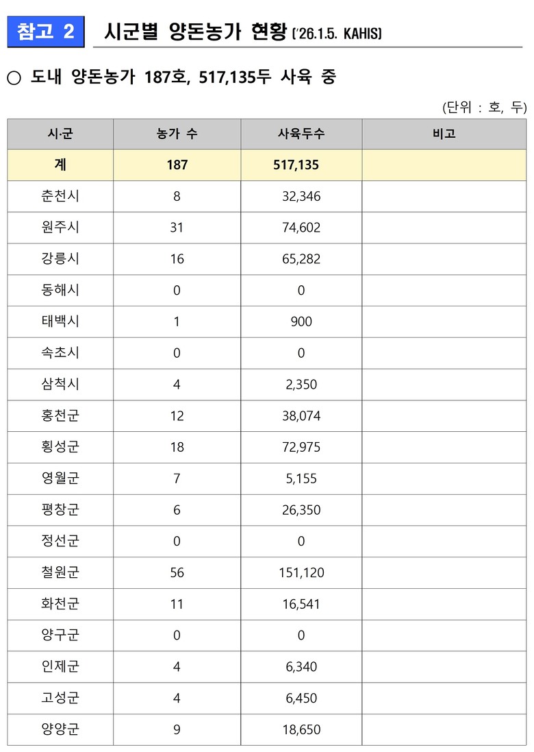 김진태 강원특별자치도지사는 “아프리카돼지열병은 한 번 발생하면 지역 축산업 전반에 막대한 피해를 초래하는 국가적 재난형 가축질병”이라며, “관계기관과 긴밀히 협력해 발생 지역을 중심으로 관내 양돈농장 전담관제를 철저히 운영하고, 초동방역과 차단 조치에 모든 행정력을 집중해 추가 확산을 반드시 차단하라”고 지시했다.
