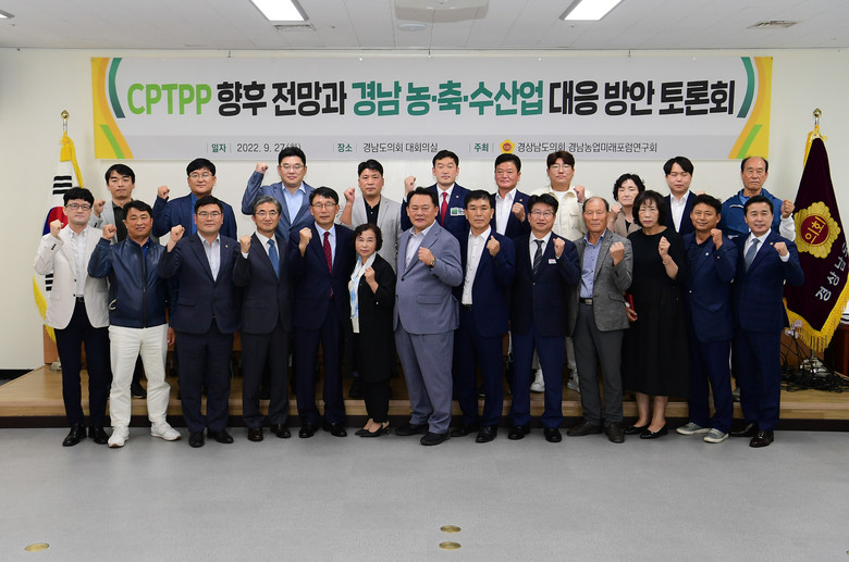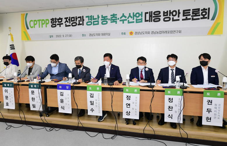 [경남 세계타임즈=최성룡 기자] 경상남도의회 의원 연구단체인 경남농업미래포럼연구회(회장 예상원 의원)는 9월 27일 경상남도의회 대회의실에서 포괄적·점진적 환태평양경제동반자협정(CPTPP) 체결 대비 경상남도 농·축·수산업 피해에 대한 분석과 대책을 마련하기 위해 토론회를 가졌다.