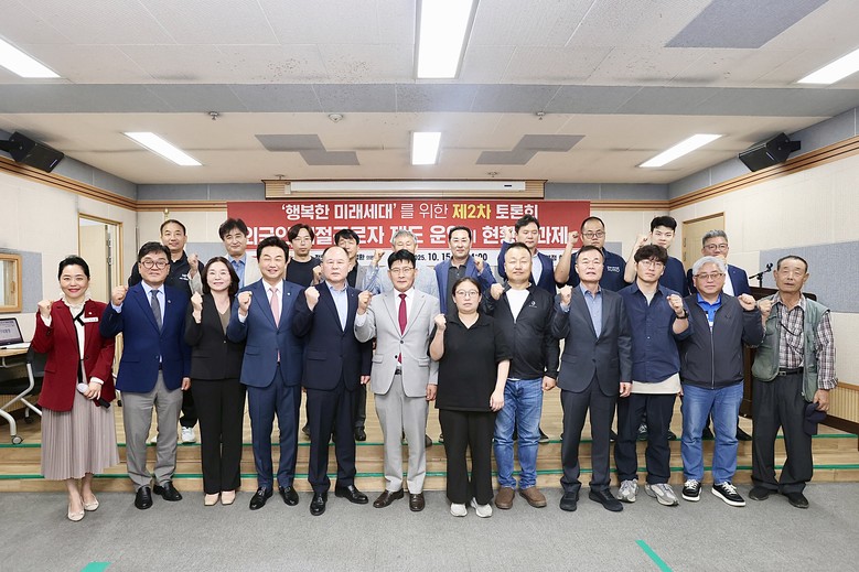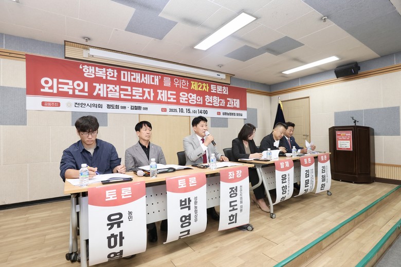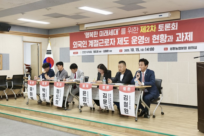[천안시 세계타임즈=이현진 기자] 천안시의회(의장 김행금)는 10월 15일(수) 오후 2시 성환농협 본점 회의실에서 정도희 의원(불당1·2동, 국민의힘)과 김철환 의원(성환읍·직산읍·입장면, 국민의힘) 공동 주최로 ‘행복한 미래세대를 위한 제2차 토론회’를 개최했다. 이번 토론회는 ‘외국인 계절근로자 제도 운영의 현황과 과제’를 주제로 관련 전문가와 시민들이 참석해 성황을 이뤘다.