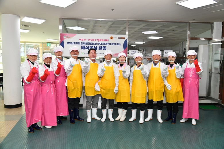 [경남 세계타임즈=최성룡 기자] 최학범 경상남도의회 의장 등 의장단 일행이 18일 김해시노인복지종합복지관 경로식당을 찾아 배식 봉사활동을 통해 따뜻한 나눔을 실천했다.
