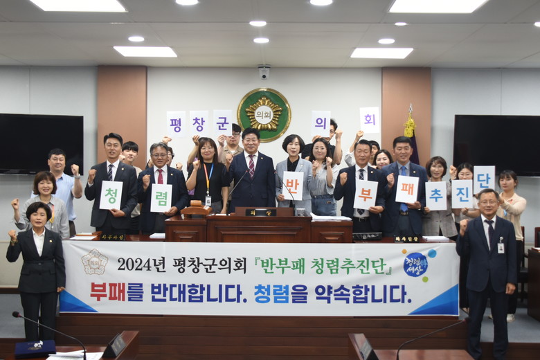 평창군의회 청렴추진단은 심현정 의장을 단장으로 하여 윤리특별위원장인 이은미 의원을 위원장으로 하는 의정활동분야와 김명기 의회사무과장을 위원장으로 하는 의회운영분야로 구성되었으며, 이 날 의회 본회의장에서는 의원과 직원 전원이 참석한 가운데 각 분야 위원장들의 청렴실천 다짐문 대표선서를 통해 청렴에 대한 의지를 강력하게 표명했다.