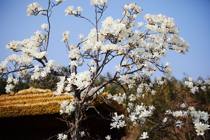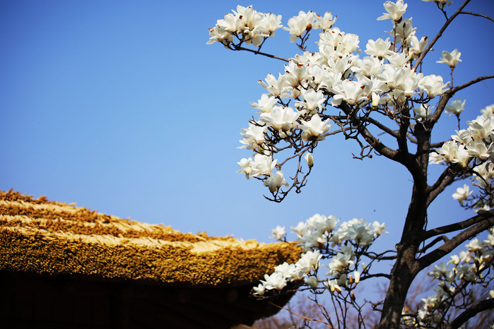 봄기운이 완연한 27일 대하소설 <토지>의 무대 하동군 악양면 평사리 최참판댁 인근 토지마을에 만개한 목련꽃이 초가지붕과 어우러져 아름다운 자태를 선보이고 있다.