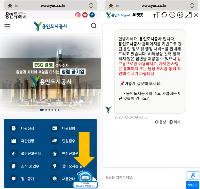 | ▲ AI 챗봇 서비스 화면.(사진=용인도시공사) |