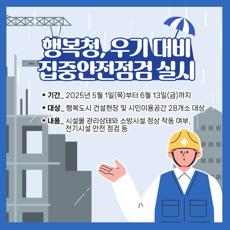 ‘대한민국 범부처 집중안전점검 계획’에 따라 진행되는 이번 점검은 두 단계로 나누어 진행된다. 먼저, 5월 1일부터 12일까지는 각 현장에서 행복청이 배포한 ‘현장점검 체크리스트’를 활용해 자체 점검을 실시한다.