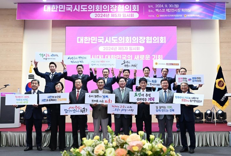 [부산 세계타임즈=이용우 기자] 부산광역시의회(의장 안성민)는 「2024년 대한민국시도의회의장협의회 제5차 임시회」를 9. 30.(월) 오후 4시 부산 벡스코 제2전시장에서 개최했다고 밝혔다.