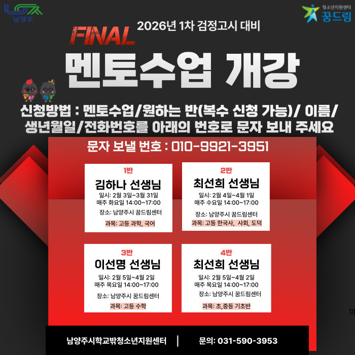 학습 멘토링 프로그램 신청은 1월 21일부터 가능하며, 참여를 희망하는 청소년은 남양주시학교밖청소년지원센터를 통해 접수하면 된다.