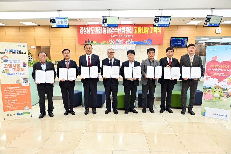 [경남 세계타임즈=최성룡 기자] 경남도의회 농해양수산위원회(위원장 김현철)는 12월 5일, 경남농협본부에서 고향사랑 기부제 홍보를 위해 위원 간 릴레이 기부 행사를 개최했다.