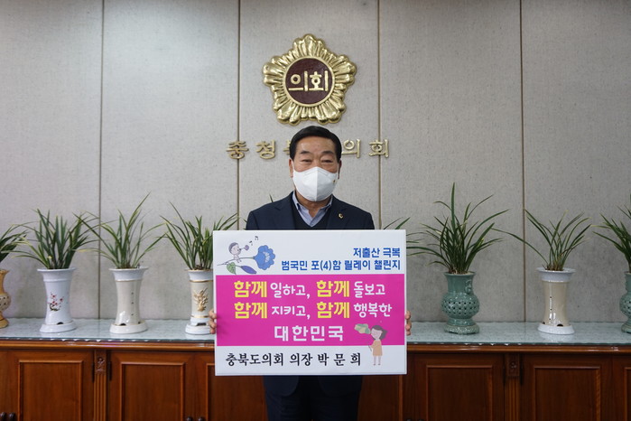 충북도에서 첫 주자로 나선 박문희 의장은 페이스북을 통해 ‘함께 일하고, 함께 돌보고, 함께 지키고, 함께 행복한 대한민국‘이라고 적힌 팻말을 들고 찍은 사진을 게시하고 저출산 극복 메시지를 전했다.