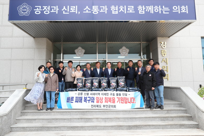 부안군의회 김광수 의장은 “이재민들이 빠르게 일상생활로 돌아갈 수 있도록 최선을 다해 지원하고자 했다.”며, “이번 강릉시 구호 물품 전달을 계기로 상호 재난 상황에서 서로 돕고 협력할 수 있는 계기가 마련되길 바란다.”고 전했다.