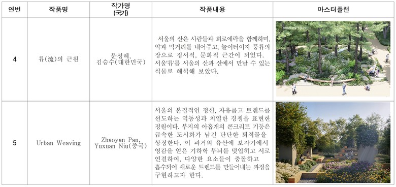 시는 지난해 12월 ‘서울류(流)-The Wave of Seoul’를 주제로 진행한 ‘2026 서울국제정원박람회 작가정원 국제공모’를 통해 국내외 전문가들의 작품 제안을 접수하고, 2단계 심사를 거쳐 총 5개 작품(해외 3개, 국내 2개)을 최종 선정했다.