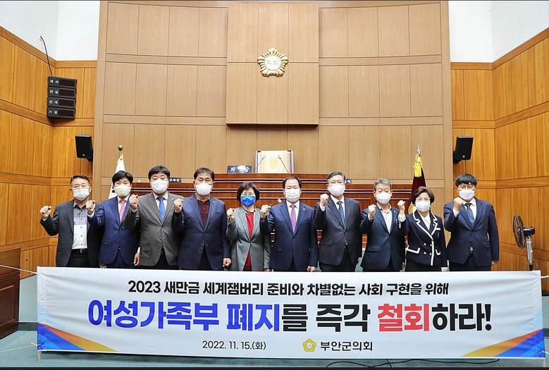 부안군의회는 건의안에서 우리 사회의 성평등 수준을 높여오고 인권의 보편적 가치 보장 및 평등사회 실현에 기여해 온 여성가족부 폐지를 철회해 차별 없는 성평등 사회를 구현하고 대규모 국제행사인 2023 세계잼버리가 차질 없이 성공적으로 개최될 수 있도록 만전을 기할 것을 정부와 국회에 촉구했다.