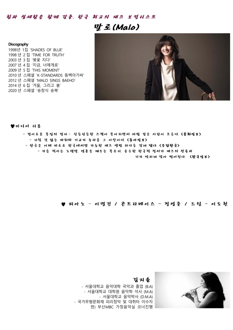 이날 말로와 김지윤 국악인(소리연구회 숲 대표)의 콜라보 무대를 선보인다. 말로는 자신의 곡 ‘너에게로 간다’ 외에도 대중가요 명곡과 한국 전통가요 등을 재즈로 재해석해 들려줘 한국적 재즈 보컬리스트로 유명하다.