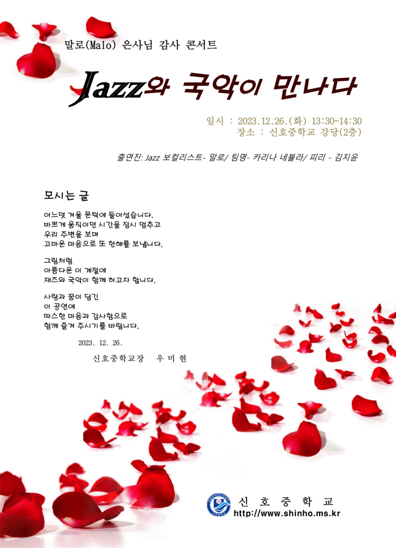 우미현 신호중학교장은 “첫 담임 시절 수학 영재로 만난 말로가 이렇게 공연을 수락해줘 너무 감사하다”며, “그동안 수고한 학생과 선생님들이 재즈와 국악의 감미로운 콜라보를 통해 행복한 시간을 갖길 바란다”고 말했다.