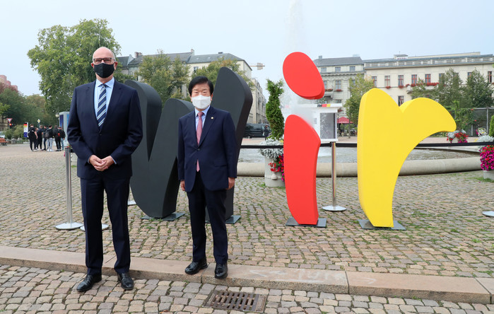 [세계타임즈 이영진 기자]박병석 국회의장이 1일 오전(현지시간) 독일 포츠담에서 열린 통일 엑스포에 참석해 디트마르 보이트케 독일 연방 상원의장과 면담을 갖고 통독 30주년을 축하하며 한반도 평화와 통일 방안에 대해 논의했다.