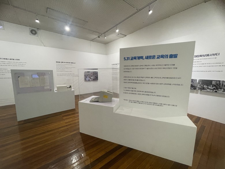 전시 구성은 교육 개혁 당시 제작된 문화영화 <열린 교육>을 주축으로 세계화 및 정보화 교육, 학교운영위원회 도입, 교육 재정 확대 등 핵심 정책들을 다룬다. 관람객들은 이를 통해 현재 시행 중인 교육 정책들의 기원과 발전 과정을 심도 있게 이해할 수 있다. 주요 전시 유물로는 당시의 시대상을 보여주는 교육 개혁 자료집을 비롯해 CRT 모니터, 하이텔 단말기, 대덕초 컴퓨터 통신 설비 계획서 등이 전시된다
