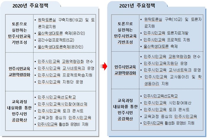 2021년 민주시민교육 추진 상황은 원탁토론실 환경구축 지원(초·중·고 10교), 민주시민교육 선도학교(초·중·고 10교), 학생자치실 구축 지원(초·중·고 10교), 학생자치활동 중점학교(초·중·고 45교), 학교예산 새싹학교(초·중·고 10교), 교사동아리, 학생동아리 등 공모사업이 진행되고 있습니다.