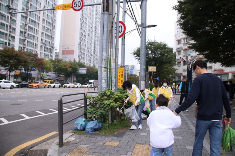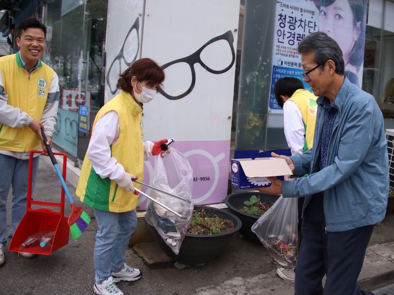 | ▲지난 16일 신천지자원봉사단 동작지부의 거리 청소 봉사가 신대방 1동에서 진행된 가운데 아이가 등원하며 동작구 현대아파트 앞 거리를 청소하는 봉사자를 보고 있다. [사진 제공 = 신천지자원봉사단 동작지부] |