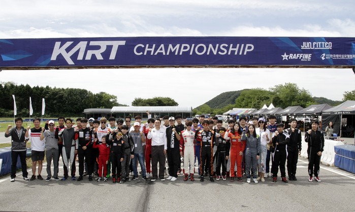 [사진설명]지난 2일 파주 스피드파크에서 열린 2018 카트 챔피언십 3라운드 경기에서 참가자들이 스타트 아치에 모여 단체사진을 촬영하고 있다.