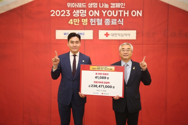 ‘위아레드 생명 나눔 캠페인 2023 생명 ON YOUTH ON 4만 명 헌혈 종료식’에는 위아원 홍준수 대표, 대한적십자사 조남선 혈액관리본부장 외 각 단체 관계자들이 참여했다.