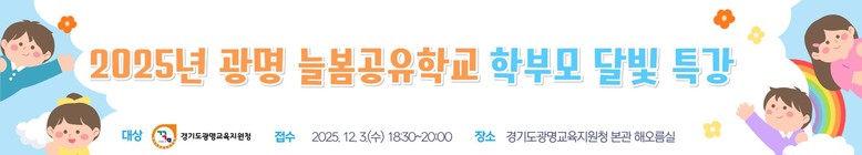 [광명시 세계타임즈=송민수 기자] 경기도광명교육지원청(교육장 김명순) 늘봄지원센터는 오는 12월 3일, ‘전문가에게 듣는 슬기로운 초등학교 생활’이라는 주제로 광명 늘봄공유학교 학부모 달빛 특강을 개최한다고 전했다.