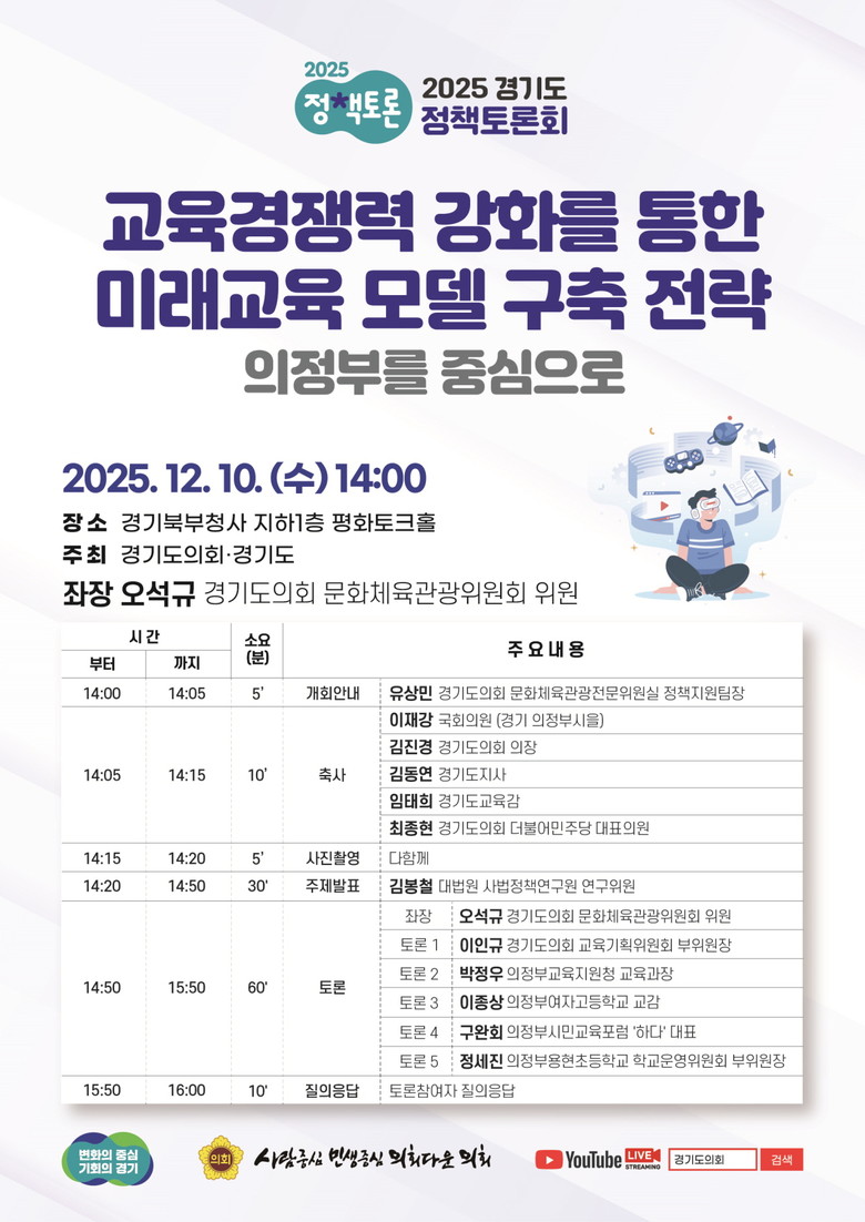 이번 정책토론회는 지역 학생 유출의 주된 원인으로 교육 환경과 학습 기회의 격차, 진로 선택의 한계 등을 문제의 원인으로 분석하고, 학생 유출은 단순히 인구 감소에 그치지 않고 지역 경제의 선순환 구조를 악화시키는 중대한 문제라는 점에 공감대를 형성하여 이를 해결하기 위한 ‘의정부형 미래교육모델’에 대한 학부모, 선생님, 전문가가 모여 토론 할 예정이다.