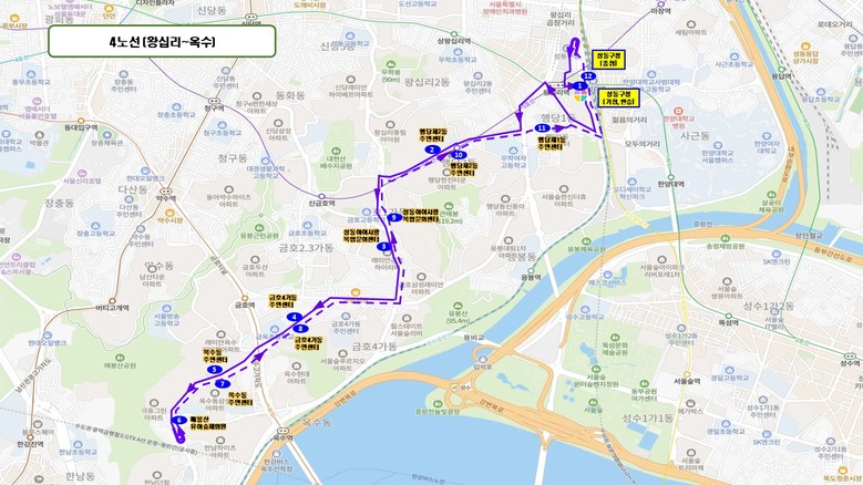오는 11월 3일부터는 기존 3개 노선에 더해 총 4개 노선으로 확대 운영한다. 이번에 신설되는 4노선은 성동구청(왕십리역 6-1번 출구)을 기점으로 출발해 ▲행당2동 주민센터 ▲금호4가동 주민센터 ▲옥수동 주민센터를 경유하며 옥수동 ‘매봉산 유아숲체험원’까지 순환하는 경로로 운행된다.
