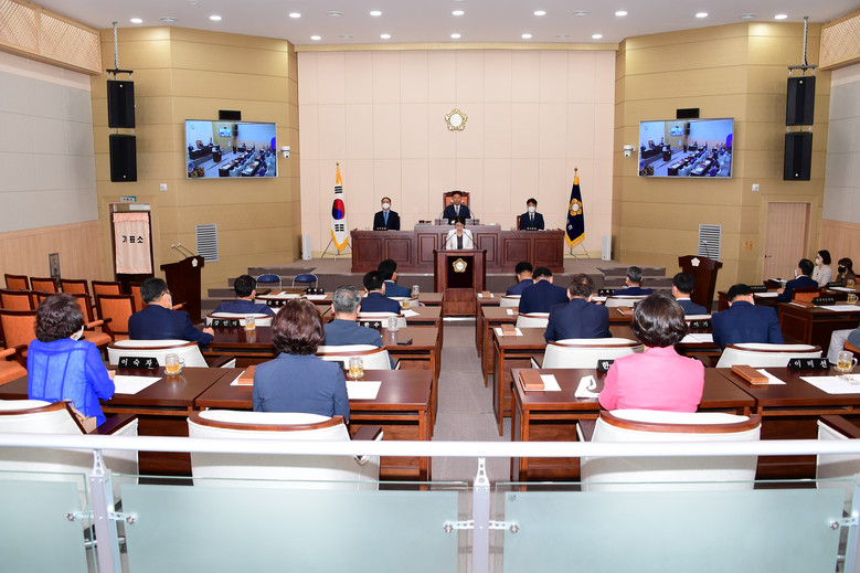 오후 2시 의회 본회의장에서 열린 제9대 의회 개원식에는 전평기 의장의 선창으로 전체 의원이 의원선서문을, 이어 이미선 부의장이 대표로 의원윤리강령을 낭독했다.