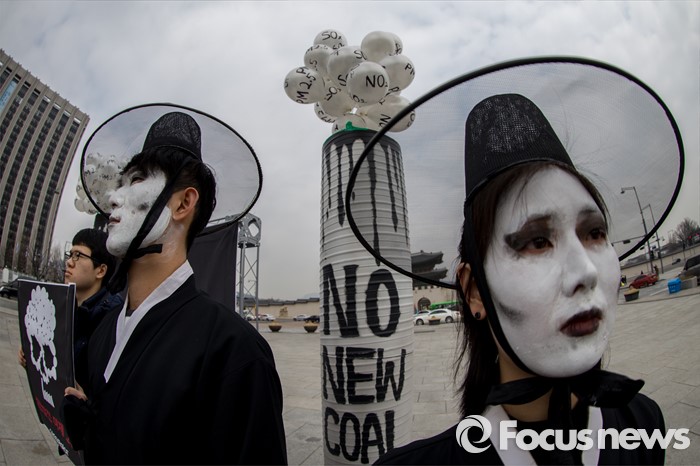 손민우 그린피스 서울사무소 기후에너지 캠페이너는 "석탄화력발전소 추가 건설은 국민의 건강뿐만 아니라 기후변화와 같은 중요한 국제문제를 해결하기 위해서도 반드시 중단돼야 한다"며 "대부분 선진국들은 온실가스 감축을 위해 석탄화력발전소를 축소하고 있는데 한국만이 거의 유일하게 구시대 에너지원에 집착하고 있다"고 꼬집었다.3일 오전 서울 종로구 광화문광장에서 그린피스 회원들이 충남지역 신규 석탄화력발전소 허가 취소를 촉구하는 퍼포먼스를 펼치고 있다. 2016.03.03 강진형 기자