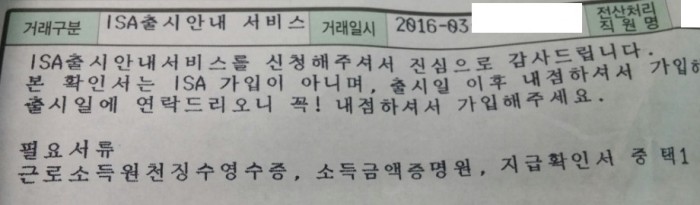임종룡 금융위원장은 "경쟁이 과열된 경향이 있다"며 "불완전판매 등에 대한 모니터링을 강화할 방침"이라고 말한 바 있다.신한은행이 영업점 창구에서 진행 중인 ISA출시안내 서비스. 손예술 기자 kunst@focus.co.kr신한은행이 ISA출시안내 서비스 신청 동의를 받은 고객에게 보낸 문자메시지.손예술 기자 kunst@focus.co.kr