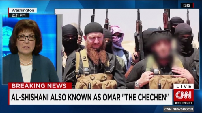 알시샤니는 체첸 반군 출신으로, 미국 정부가 500만달러(약 59억3600만원)의 현상금을 건 '국방장관급' IS 인물이다. 미 국방부는 지난 9일 알시샤니가 "사망 가능성이 있다"고 발표했다.수니파 극단주의 무장단체 이슬람국가(IS) 최고사령관 알 시샤니(가운데). <사진출처=CNN 캡처>