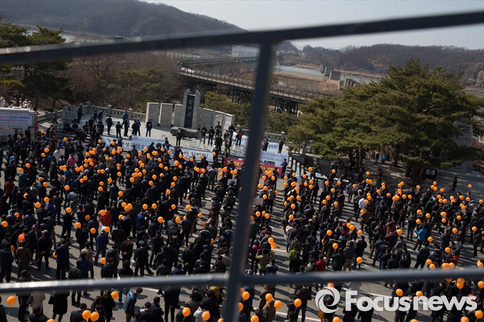 (파주=포커스뉴스) 16일 오후 경기도 파주시 임진각 망배단에서 개성공단 입주기업, 영업기업, 협력기업 등 대표를 비롯한 임직원과 가족들이 '개성공단 평화대행진 집회'를 하고 있다.