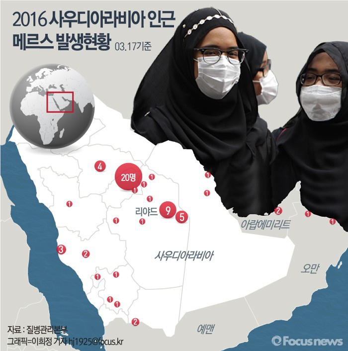 (서울=포커스뉴스) 17일 사우디아라비아 보건부 등에 따르면 2016년 1월부터 현재까지 중동 호흡기질환 환자는 사우디아라비아 및 주변 국가(오만, 아랍에미리트) 에서 총 69명 발생했고, 이중 65명이 사우디아라비아에서 감염됐다.