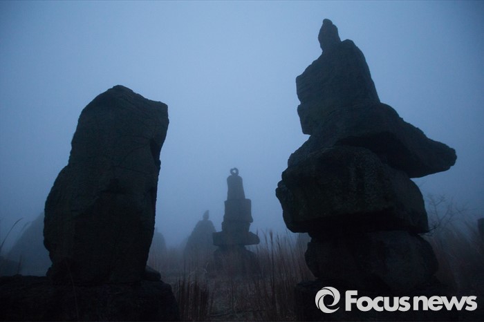 (제주=포커스뉴스) 안개 낀 18일 오후 제주시 남조로 돌문화공원에 마을의 무사안녕을 기원하는 방사탑들이 놓여져 있다.