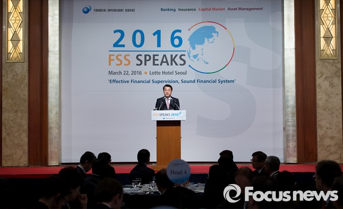 (서울=포커스뉴스) 22일 오전 서울 중구 소공로 롯데호텔에서 진웅섭 금융감독원장이 외국계금융회사 대상 업무설명회 'FSS SPEAKS 2016'에 참석해 기조연설을 하고 있다.
